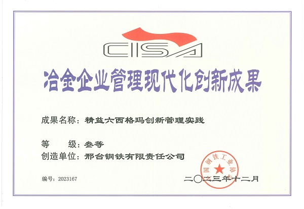 "Practice of Lean Six Sigma Innovation Management" by Xingtai Steel was awarded the 21st (2023) Metallurgical Enterprise Management Modernization Innovation Achievement Award.