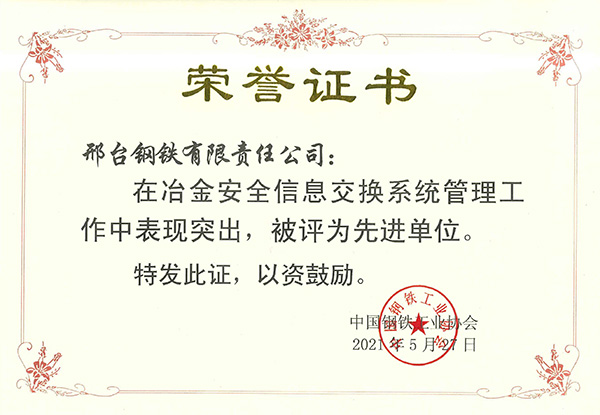Xingtai Steel was awarded as "Advanced Units in Emergency Management and work Safety in 2021" by Emergency Management and work Safety Association of Hebei Province.