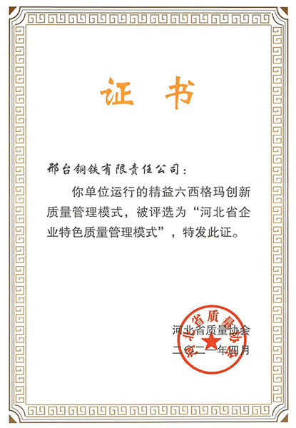 The list of the first batch of " Characteristic Quality Management Model of Hebei Enterprise " selected by the Hebei Quality Association was announced. Xingtai Iron and Steel Cor., Ltd. (hereinafter referred to as Xingtai Steel), as one of the 10 enterprises received this award, declared the "innovative managerial model on implementing the Lean Six Sigma" which was listed in the first batch of " Characteristic Quality Management Model of Hebei Enterprise" by virtue of its advanced concept, scientific method, easy-to-implement measures and obvious effects.