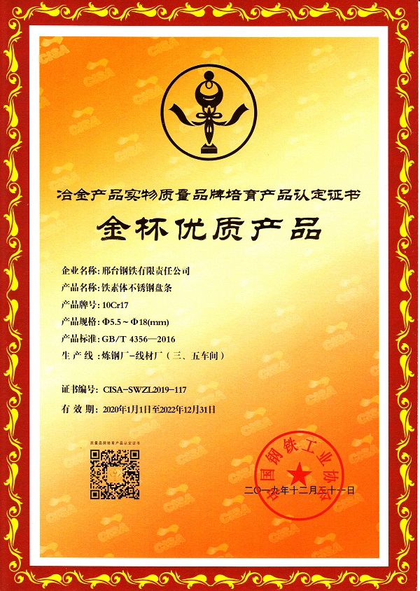 邢鋼鐵素體不銹鋼盤條10Cr17 φ5.5-18mm規(guī)格獲冶金產品實物質量金杯優(yōu)質產品認定證書