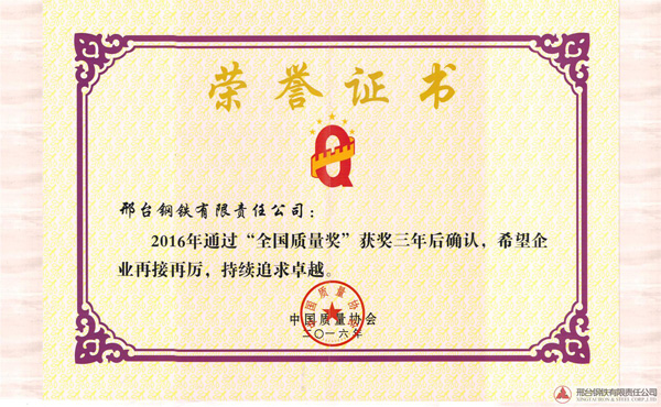 邢鋼于2013年獲得全國(guó)質(zhì)量獎(jiǎng),獲獎(jiǎng)后邢鋼繼續(xù)實(shí)踐《卓越績(jī)效評(píng)價(jià)準(zhǔn)則》,深入推進(jìn)卓越績(jī)效管理模式,持續(xù)改進(jìn),不斷追求卓越。2016年9月全國(guó)質(zhì)量獎(jiǎng)評(píng)審活動(dòng)領(lǐng)導(dǎo)小組組織專家對(duì)邢鋼進(jìn)行了全國(guó)質(zhì)量獎(jiǎng)獲獎(jiǎng)三年后的現(xiàn)場(chǎng)確認(rèn),通過(guò)專家小組的現(xiàn)場(chǎng)提問(wèn)、材料匯報(bào)、生產(chǎn)現(xiàn)場(chǎng)的參觀,邢鋼順利通過(guò)了“全國(guó)質(zhì)量獎(jiǎng)”獲獎(jiǎng)三年后確認(rèn)并頒發(fā)證書(shū)。