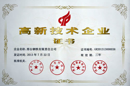 2013年7月22日,邢鋼被評為河北省2013年第一批“高新技術企業(yè)”。
