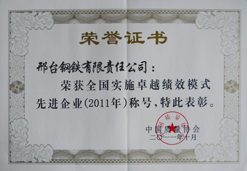 2011年10月,邢鋼榮獲“全國實(shí)施卓越績效模式先進(jìn)企業(yè)(2011年)稱號”。