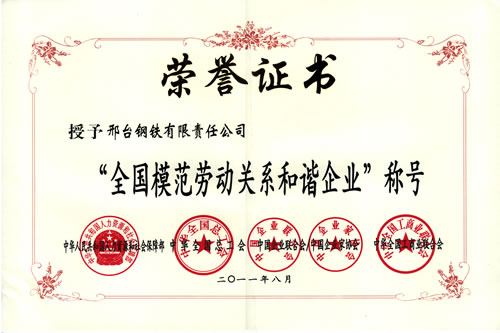 2011年8月,邢鋼榮獲由人力資源和社會保障部、全國總工會、中國企業(yè)聯(lián)合會、全國工商聯(lián)頒發(fā)的“全國模范勞動關(guān)系和諧企業(yè)”榮譽(yù)稱號。