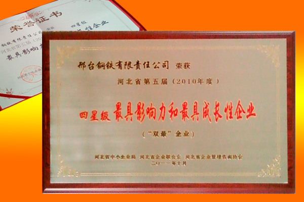 2011年10月,邢鋼榮獲“河北省第五屆(2010年度)四星級最具影響力和最具成長性企業(yè)”。