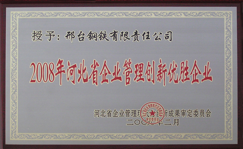 - 邢鋼榮獲“2008年河北省企業(yè)管理創(chuàng)新優(yōu)勝企業(yè)”榮譽稱號
