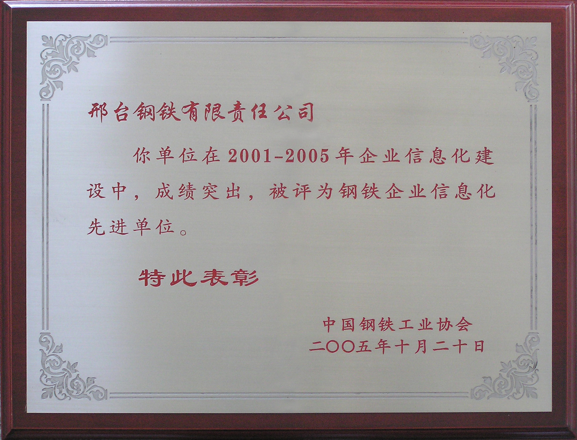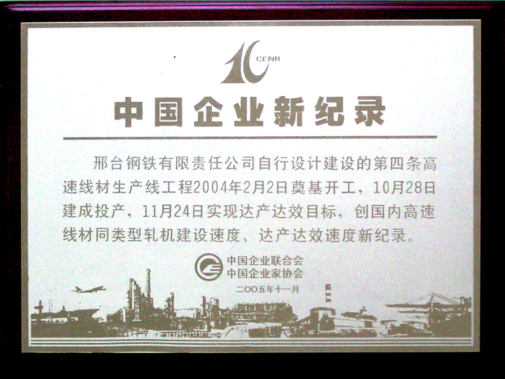 2005年11月,邢鋼自行設(shè)計(jì)建設(shè)的第四條高速線(xiàn)材生產(chǎn)線(xiàn)工程2004年2月2日奠基開(kāi)工,10月28日建成投產(chǎn),11月24日實(shí)現(xiàn)達(dá)產(chǎn)達(dá)效目標(biāo),創(chuàng)國(guó)內(nèi)高速線(xiàn)材同類(lèi)型軋機(jī)建設(shè)速度、達(dá)產(chǎn)達(dá)效速度新紀(jì)錄。