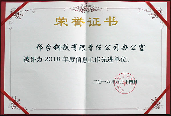 2018年8月14日,邢鋼被中國(guó)鋼鐵工業(yè)協(xié)會(huì)評(píng)為“2018年度信息工作先進(jìn)單位”。