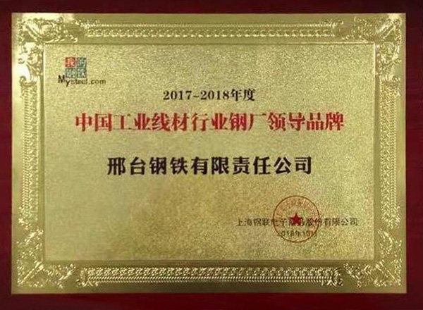 2018年10月22日,在上海舉辦的“2018年Mysteel中國(guó)工業(yè)線(xiàn)材暨緊固件產(chǎn)業(yè)鏈高峰論壇”上,論壇評(píng)委會(huì)根據(jù)對(duì)國(guó)內(nèi)工業(yè)線(xiàn)材生產(chǎn)鋼廠(chǎng)2017-2018年品牌、質(zhì)量和市場(chǎng)反饋等評(píng)比,評(píng)選出“中國(guó)工業(yè)線(xiàn)材行業(yè)鋼廠(chǎng)領(lǐng)導(dǎo)品牌”,邢鋼獲此殊榮。