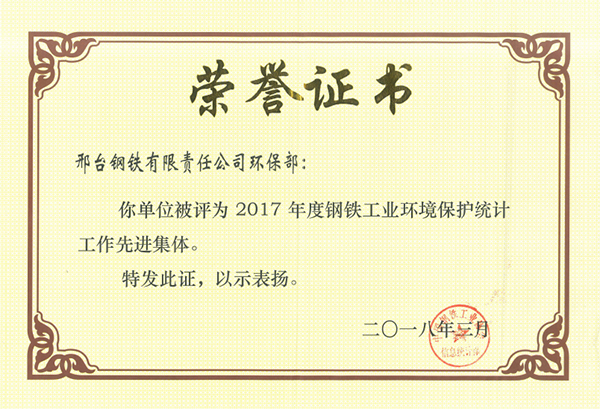 - 邢鋼被評(píng)為2017年度鋼鐵工業(yè)環(huán)境保護(hù)統(tǒng)計(jì)工作先進(jìn)集體