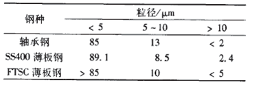 通常認為鋼中粒徑在1-50μm的非金屬夾雜物都屬于顯微夾雜物。對于高品質(zhì)特殊用途鋼種,鋼中粒徑小于10μm的顯微夾雜物占有非常大的比例。表l為國內(nèi)幾種特殊鋼中顯微夾雜物的粒徑分布?! ?/p>
