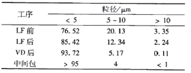 目前,鋼中顯微夾雜物的控制和去除難度較大。在冶煉過程中,鋼水溫度、鋼中成分含量、鋼包吹氬操作、中間包結構以及鑄坯冷卻速率等因素均對鋼中顯微夾雜物的粒徑分布有明顯影響。表2是采用LF-VD-中間包工藝生產(chǎn)軸承鋼時各工序鋼中顯微夾雜物的粒徑分布。