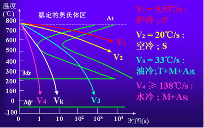 等溫轉(zhuǎn)變“TTT曲線(xiàn)”在連續(xù)冷卻轉(zhuǎn)變中的應(yīng)用:由于連續(xù)冷卻“CCT轉(zhuǎn)變曲線(xiàn)”的測(cè)定較為困難,而連續(xù)冷卻轉(zhuǎn)變可以看作由許多溫度相差很小的等溫轉(zhuǎn)變過(guò)程所組成的,所以連續(xù)冷卻轉(zhuǎn)變得到的組織可認(rèn)為是不同溫度下等溫轉(zhuǎn)變產(chǎn)物的混合物。故生產(chǎn)中常用TTT曲線(xiàn)(C曲線(xiàn))近似地分析連續(xù)冷卻過(guò)程。下圖中V1(爐冷)、V2(空冷)、V3(油冷)、V4(水冷)代表熱處理中四種常用的連續(xù)冷卻方式。