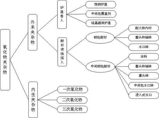 而外來夾雜主要是在鋼的熔煉、出鋼和澆鑄過程中,鋼液同耐火材料和爐渣相接觸,爐渣被卷入鋼液中(特別是出鋼的時候),耐火材料在高溫收到?jīng)_蝕,它的顆?;烊脘撘褐?,這些情況都難以避免?;烊脘撘褐械哪突鸩牧虾蜖t渣顆粒通過與鋼液起化學(xué)反應(yīng)不斷在成分和結(jié)構(gòu)上發(fā)生變化。這些顆粒,不論是剛剛被機械地帶入鋼液中的,還是經(jīng)歷了相當(dāng)變化的,一旦被滯留到鑄件中,就變成了鋼中的夾雜物,這些就叫外來夾雜物。外來一般來說尺寸較大,外形不規(guī)則,結(jié)構(gòu)復(fù)雜,只是偶然在這里或者那里出現(xiàn)。夾雜物的來源和分類下圖。