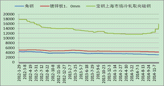 據(jù)鋼聯(lián)資訊跟蹤的部分電網(wǎng)建設(shè)用鋼價(jià)格走勢(shì)顯示,近3年來,由于鋼鐵產(chǎn)能的嚴(yán)重過剩以及下游投資建設(shè)需求的回落,鋼材價(jià)格一路持續(xù)下跌。其中用于變壓器的冷軋取向硅鋼價(jià)格從最高17800元/噸跌至13800元/噸,跌幅達(dá)22.5%,其中最低跌至11600元/噸。角鋼價(jià)格亦從最高4435元/噸跌至3094元/噸,鍍鋅板價(jià)格從最高5052元/噸下跌至4267元/噸,跌幅分別達(dá)30.2%和15.5%。從圖中可以看出,三個(gè)品種的價(jià)格在2012年跌幅相對(duì)較大。此后,價(jià)格逐步呈現(xiàn)陰跌的走勢(shì),跌幅有所收窄,冷軋取向硅鋼價(jià)格在特高壓政策利好之下,率先小幅拉升,其他兩個(gè)品種鋼材因使用面廣,依舊維持震蕩走勢(shì)。