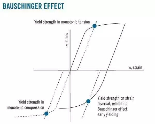 金屬材料經過預先加載產生少量塑性變形(殘余應變?yōu)?%~2%),卸載后再同向加載,規(guī)定殘余應力(彈性極限或屈服強度 )增加;反向加載,規(guī)定殘余應力降低(特別是彈性極限在反向加載時幾乎降低到零)的現(xiàn)象,稱為包申格效應。