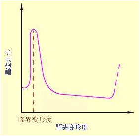 (2)預先變形度 變形度的影響主要與金屬變形的均勻度有關。變形越不均勻, 再結晶退火后的晶粒越大。變形度很小時,因不足以引起再結晶,晶粒不變。當變形度達到2~10%時,金屬中少數(shù)晶粒變形,變形分布很不均勻,所以再結晶時生成的晶核少,晶粒大小相差極大,非常有利于晶粒發(fā)生吞并過程而很快長大,結果得到極粗大的晶粒。使晶粒發(fā)生異常長大的變形度稱作臨界變形度。生產(chǎn)上應盡量避免在臨界變形度范圍內的塑性變形加工。超過臨界變形度之后,隨變形度的增大,晶粒的變形更加強烈和均勻,再結晶核心越來越多,因此再結晶后的晶粒越來越細小。但是當變形度過大(約≥90%)時, 晶??赡茉俅纬霈F(xiàn)異常長大,一般認為它是由形變織構造成的。