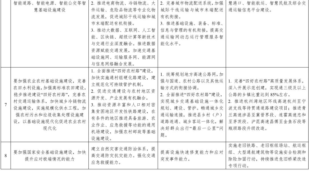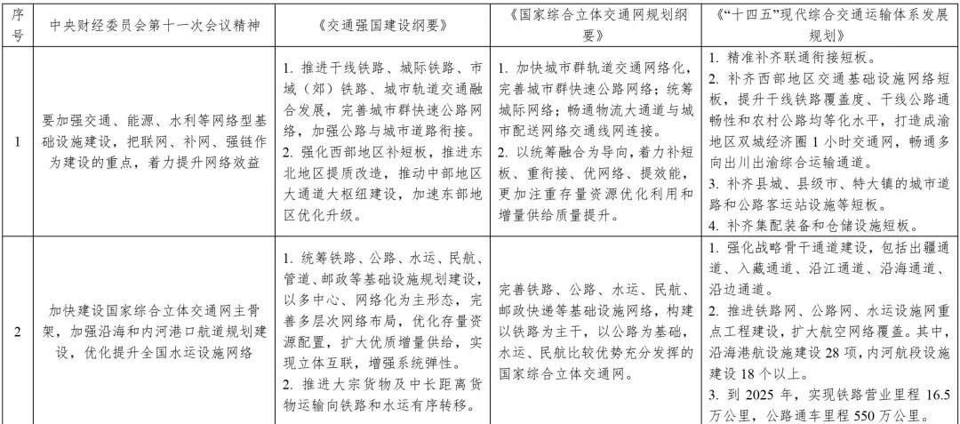 中央財(cái)經(jīng)委員會(huì)第十一次會(huì)議要求內(nèi)容與中共中央、國務(wù)院印發(fā)的《交通強(qiáng)國建設(shè)綱要》《國家綜合立體交通網(wǎng)規(guī)劃綱要》《“十四五”現(xiàn)代綜合交通運(yùn)輸體系發(fā)展規(guī)劃》等政策文件一脈相承,并有所側(cè)重,強(qiáng)化了交通、能源、水利、城鎮(zhèn)和科技等基礎(chǔ)設(shè)施在國內(nèi)國際雙循環(huán)相互促進(jìn)過程中的重要紐帶作用和產(chǎn)業(yè)鏈供應(yīng)鏈安全穩(wěn)定的保障基石作用,對(duì)構(gòu)建現(xiàn)代化基礎(chǔ)設(shè)施體系、推動(dòng)經(jīng)濟(jì)高質(zhì)量發(fā)展具有重要指導(dǎo)意義。同時(shí),兼顧了有序推進(jìn)地下綜合管廊建設(shè),加強(qiáng)城市防洪排澇、污水和垃圾收集處理體系建設(shè),加強(qiáng)防災(zāi)減災(zāi)基礎(chǔ)設(shè)施、公共衛(wèi)生應(yīng)急設(shè)施和國家安全基礎(chǔ)設(shè)施建設(shè);推進(jìn)重點(diǎn)水源、灌區(qū)、蓄滯洪區(qū)建設(shè)和現(xiàn)代化改造等內(nèi)容。表1為中央財(cái)經(jīng)委員會(huì)第十一次會(huì)議基礎(chǔ)設(shè)施建設(shè)有關(guān)內(nèi)容與相關(guān)政策文件對(duì)照。