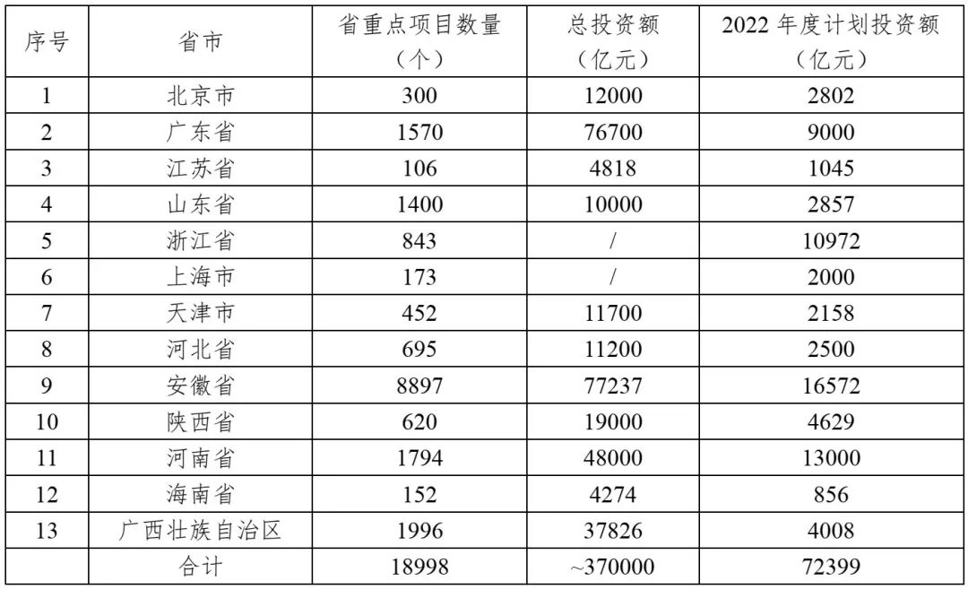 表3 2022年13省(區(qū)、市)重點(diǎn)項(xiàng)目投資情況