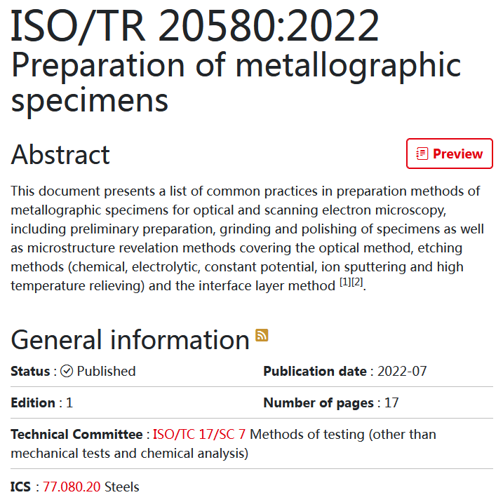 ISO/TR 20580:2022 Preparation of metallographic specimens《金相試樣的制備》國際標準近日批準發(fā)布,這是由我國主導制定的又一項金相檢驗領域國際標準。