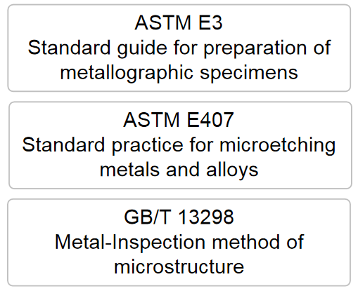 國際上與金相試樣制備相關的標準有我國標準GB/T 13298《金相顯微組織檢驗方法》和美國標準ASTM E3《金相試樣的制備》、ASTM E407《金屬和合金的微觀浸蝕》。我國標準GB/T 13298的前半部分“金相試樣的制備方法”與ASTM E3和ASTM E407內(nèi)容類似,但ISO一直沒有金相試樣制備的相關標準。
