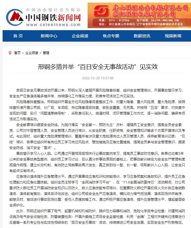 此外,邢鋼還組織開展了電氣、起重機械和機械防護、鍋爐壓力容器和消防、危險化學(xué)品專業(yè)檢查;對建筑消防設(shè)施及電氣安全設(shè)施檢測,防雷裝置檢測;開展外委施工項目安全監(jiān)督檢查,利用“金睛”工程對關(guān)鍵崗位違章進行反查等一系列專業(yè)性與實效性相結(jié)合的“百日安全無事故”活動,持續(xù)推進公司安全發(fā)展,實現(xiàn)安全生產(chǎn)形勢穩(wěn)定。