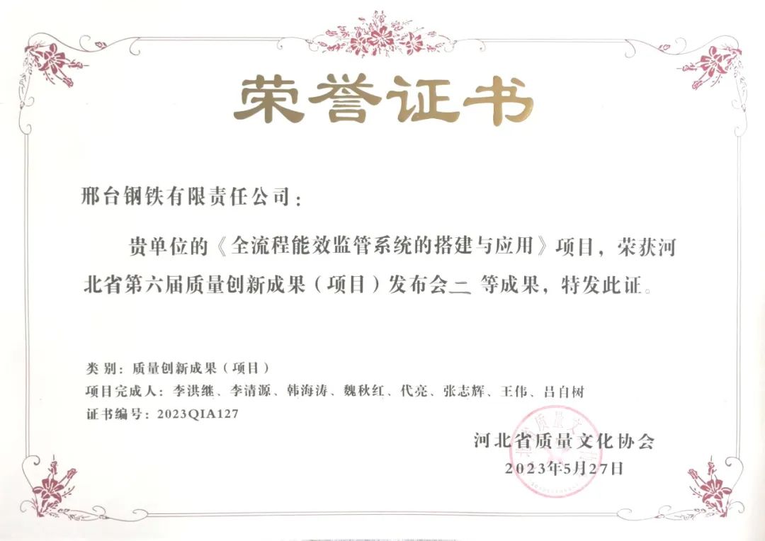 多年來,秉承“干成事”的核心價值觀,積極踐行特鋼精品戰(zhàn)略,邢鋼在轉(zhuǎn)型升級的高質(zhì)量發(fā)展過程中,走出了一條創(chuàng)新型標(biāo)桿道路。作為河北省質(zhì)量文化協(xié)會會員單位,邢鋼已連續(xù)多年應(yīng)邀參加“河北省質(zhì)量創(chuàng)新成果發(fā)布會”,截至目前,邢鋼已經(jīng)累計榮獲河北省質(zhì)量創(chuàng)新示范級成果12項、專業(yè)級成果11項、改進(jìn)級成果5項。