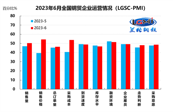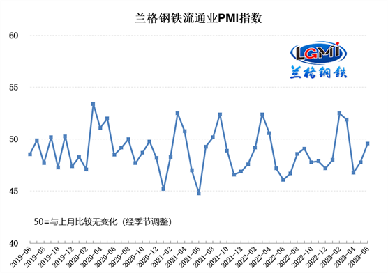 蘭格鋼鐵網(wǎng)統(tǒng)計發(fā)布的2023年6月份鋼鐵流通業(yè)PMI總指數(shù)為49.6%,比上月上升1.8個百分點,在收縮區(qū)間內(nèi)繼續(xù)回升。從分類指數(shù)看,構成鋼鐵流通業(yè)PMI的10個分類指數(shù)6升3降1平,其中銷售量、銷售價格、總訂單量、采購成本、走勢判斷和采購意愿6項指數(shù)上升,到貨速度、庫存水平和融資環(huán)境3項指數(shù)下降,企業(yè)雇員1項指數(shù)持平。