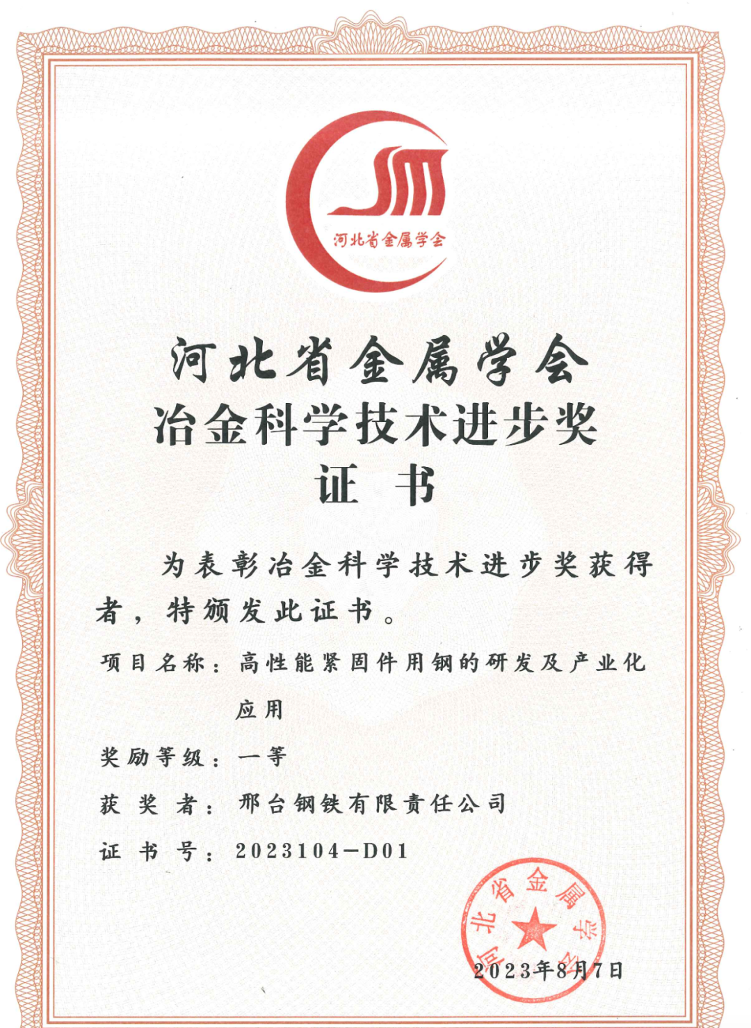 近日,邢臺鋼鐵有限責(zé)任公司兩項科技研發(fā)項目“高性能緊固件用鋼的研發(fā)及產(chǎn)業(yè)化應(yīng)用項目”“汽車底盤異形件用大規(guī)格高淬透性高潔凈度冷鐓鋼的研發(fā)及應(yīng)用”得到河北省金屬學(xué)會專家評審委員會的高度認可,分別榮獲2023年度的 “河北冶金科學(xué)技術(shù)獎”一、二等獎。