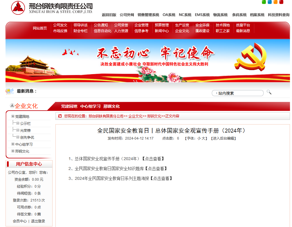 據(jù)悉,今年全民國家安全教育日的活動主題為“總體國家安全觀·創(chuàng)新引領(lǐng)10周年”。活動中,邢鋼公司高度重視,堅定不移貫徹總體國家安全觀,提高政治站位,牢牢把握正確政治方向和輿論導(dǎo)向,并在教育活動中,做到深入學(xué)習(xí)領(lǐng)會《習(xí)近平關(guān)于總體國家安全觀論述摘編》以及習(xí)近平總書記在黨的二十大報告中提出的:“推進(jìn)國家安全體系和能力現(xiàn)代化,堅決維護(hù)國家安全和社會穩(wěn)定”的講話精神,廣泛宣傳憲法規(guī)定的公民維護(hù)祖國安全、榮譽和利益的基本義務(wù)。