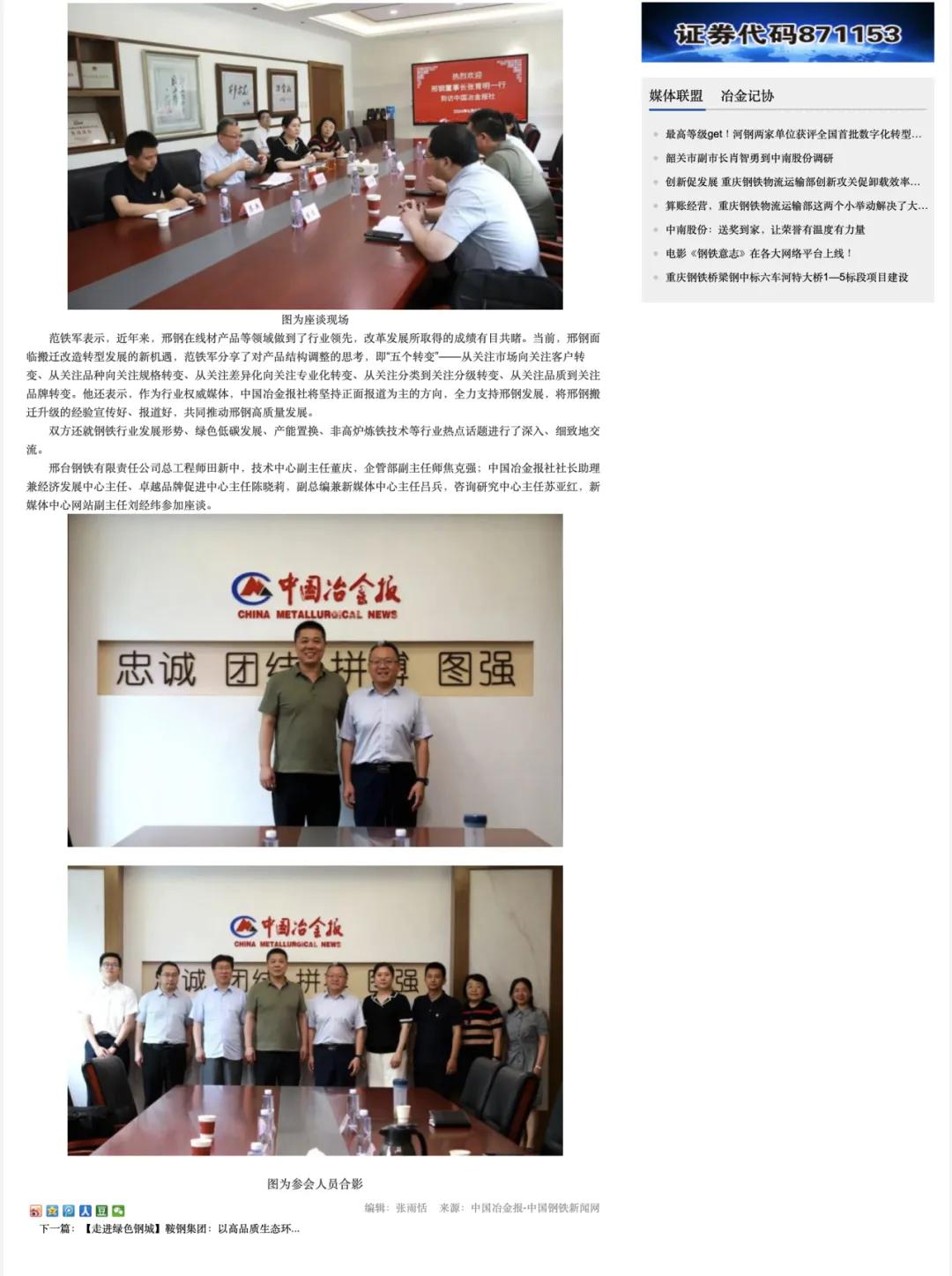 雙方還就鋼鐵行業(yè)發(fā)展形勢、綠色低碳發(fā)展、產(chǎn)能置換、非高爐煉鐵技術(shù)等行業(yè)熱點話題進(jìn)行了深入、細(xì)致地交流。