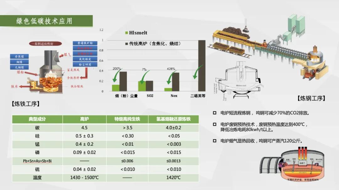 一是布局“碳達(dá)峰、碳中和”,實(shí)現(xiàn)綠色化,引領(lǐng)品牌可持續(xù)發(fā)展。采用的“熔融還原+電爐煉鋼”短流程工藝,取消了燒結(jié)、球團(tuán)、焦化、預(yù)還原等工藝環(huán)節(jié),為世界首創(chuàng);和長流程工藝相比,預(yù)計(jì)可減少二氧化硫、氮氧化物排放38%,減少顆粒物排放89%,建廠即達(dá)到A級(jí)企業(yè)標(biāo)準(zhǔn),實(shí)現(xiàn)綠色冶金,對(duì)我國乃至世界鋼鐵行業(yè)發(fā)展具有創(chuàng)新性和引領(lǐng)示范的意義,是鋼鐵行業(yè)綠色轉(zhuǎn)型的典范。