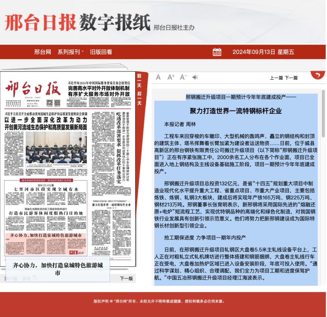 邢鋼搬遷升級(jí)項(xiàng)目總投資132億元,是省“十四五”規(guī)劃重大項(xiàng)目中制造業(yè)現(xiàn)代化水平提升重大工程、省重點(diǎn)項(xiàng)目、市重大產(chǎn)業(yè)項(xiàng)目,主要包括煉鐵、煉鋼、軋鋼3大板塊,建成后將實(shí)現(xiàn)年產(chǎn)鐵165萬(wàn)噸、鋼225萬(wàn)噸、鋼材213萬(wàn)噸。邢鋼董事長(zhǎng)張育明表示,新邢鋼將采用國(guó)際先進(jìn)的“熔融還原+電爐”短流程工藝,實(shí)現(xiàn)優(yōu)特鋼品種的高端化和綠色化制造,對(duì)我國(guó)鋼鐵行業(yè)發(fā)展具有創(chuàng)新引領(lǐng)示范意義。他們將努力把新邢鋼建設(shè)成為國(guó)際特鋼長(zhǎng)材創(chuàng)新型引領(lǐng)企業(yè)。