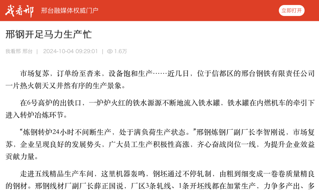 在 6 號(hào)高爐的出鐵口,一爐爐火紅的鐵水源源不斷地流入鐵水罐,鐵水罐在內(nèi)燃機(jī)車(chē)的牽引下進(jìn)入轉(zhuǎn)爐冶煉環(huán)節(jié)。“煉鋼轉(zhuǎn)爐 24 小時(shí)不間斷生產(chǎn), 處于滿(mǎn)負(fù)荷生產(chǎn)狀態(tài)。”邢鋼煉鋼廠副 廠長(zhǎng)李智剛說(shuō),市場(chǎng)復(fù)蘇,企業(yè)呈現(xiàn)良好的發(fā)展勢(shì)頭,廣大員工生產(chǎn)積極性高漲,齊心奮戰(zhàn)崗位一線(xiàn),為提升企業(yè)效益貢獻(xiàn)力量。走進(jìn)五線(xiàn)精品生產(chǎn)車(chē)間,這里機(jī)器轟鳴,鋼坯通過(guò)不停軋制,由粗到細(xì)變成一卷卷質(zhì)量精良的鋼材。邢鋼線(xiàn)材廠副廠長(zhǎng)薛正國(guó)說(shuō),廠區(qū) 3 條軋線(xiàn)、 1 條開(kāi)坯線(xiàn)都在加緊生產(chǎn),力爭(zhēng)多產(chǎn) 出、多收益。近年來(lái),邢鋼致力于轉(zhuǎn)型升級(jí)促進(jìn)高質(zhì)量發(fā)展,專(zhuān)注于工業(yè)新材料的研發(fā)制造,公司優(yōu)特鋼比例達(dá) 100%,高新產(chǎn)品達(dá) 70%以上,擁有冷鐓鋼、純鐵、彈簧鋼等 18 大類(lèi) 600 多個(gè)鋼種 3500 多種產(chǎn)品,廣泛應(yīng)用于汽車(chē)、大跨 度橋梁、鐵路等國(guó)家優(yōu)先發(fā)展的領(lǐng)域。高品質(zhì)特鋼產(chǎn)品讓邢鋼不斷贏得市場(chǎng)認(rèn)可。前不久,在上海國(guó)際緊固件 工業(yè)博覽會(huì)和 2024 印尼雅加達(dá)東南亞緊固件專(zhuān)業(yè)展上,邢鋼與巴西、越南等多個(gè)國(guó)家的企業(yè)達(dá)成合作意向;邢鋼的“新能源汽車(chē)用高強(qiáng)度超高潔凈度冷鐓鋼技術(shù)創(chuàng)新及應(yīng)用”項(xiàng)目經(jīng)河北省質(zhì)量 文化協(xié)會(huì)選拔、中國(guó)質(zhì)量協(xié)會(huì)推薦,成功入圍 2024 年度國(guó)際質(zhì)量創(chuàng)新大賽。“邢鋼專(zhuān)注高端鋼材生產(chǎn),市場(chǎng)競(jìng)爭(zhēng)力強(qiáng),訂單充足,未來(lái)一個(gè)月的訂單已經(jīng)基本排滿(mǎn),多種規(guī)格產(chǎn)品訂單量增長(zhǎng)。”在五線(xiàn)中控室,薛正國(guó)在電腦上翻看排單表,信心十足地說(shuō)“,在市場(chǎng)大環(huán)境穩(wěn)定的情況下,訂單量有保證。”在采訪中,五線(xiàn)精品生產(chǎn)車(chē)間主任張志斌說(shuō),火力全開(kāi)的生產(chǎn)景象令人振奮,他將把自己 20 年的工作經(jīng)驗(yàn)運(yùn)用到生產(chǎn)中去,推動(dòng)鋼材標(biāo)準(zhǔn)化生 產(chǎn),滿(mǎn)足客戶(hù)的需求,不斷提升產(chǎn)品質(zhì)量和邢鋼品牌滿(mǎn)意度。