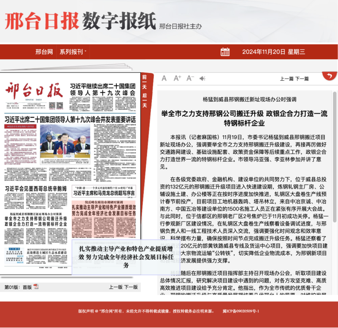 楊猛隨后在邢鋼搬遷項目指揮部主持召開現(xiàn)場辦公會,聽取項目建設總體情況匯報,研究解決項目建設中遇到的問題,對各方攻堅克難、高質(zhì)高效推進項目建設給予充分肯定。他指出,作為全市傳統(tǒng)的優(yōu)質(zhì)骨干企業(yè),邢鋼的搬遷升級與高質(zhì)量發(fā)展凝結著幾代邢臺人的夙愿,對維護發(fā)展穩(wěn)定大局、實現(xiàn)全市跨越趕超意義重大,全市上下要搶抓“百泉復涌”歷史新機遇,增強務實擔當?shù)呢熑胃泻头置氡貭幍木o迫感,搶抓黃金施工期,舉全市之力破解關鍵難題、強化要素保障,全力推動邢鋼新廠區(qū)盡快建成投產(chǎn)、老廠區(qū)按時關停。威縣要提高站位、統(tǒng)一思想,一鼓作氣推進服務保障工作,積極組織銀企對接、產(chǎn)業(yè)招商、產(chǎn)品推介等活動,引導形成全社會支持邢鋼發(fā)展的良好氛圍,切實放大邢鋼新廠輻射帶動效應,努力打造獨具特色的特鋼產(chǎn)業(yè)集群。各金融機構要形成工作合力,創(chuàng)新金融產(chǎn)品,主動加強與企業(yè)對接服務,積極爭取上級金融機構支持,為項目建設提供堅實保障。市直相關部門要積極對接項目建設,提前介入、靠前服務,吃透用好各項有利政策,拿出幫助搬遷建設的硬政策硬舉措,形成推動后續(xù)發(fā)展的政策合力,把邢鋼打造成為我市新材料產(chǎn)業(yè)的強力支撐。