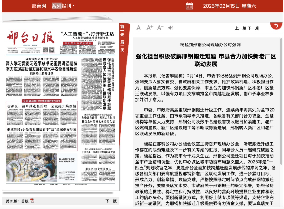 2月14日,市委書記楊猛到邢鋼公司現(xiàn)場辦公,強調(diào)要深入落實省委、省政府相關(guān)工作要求,搶抓政策機遇、積極擔(dān)當(dāng)作為,創(chuàng)新融資方式、強化要素保障,市縣合力加快邢鋼新廠區(qū)和老廠區(qū)搬遷聯(lián)動發(fā)展,以強有力項目支撐助推全市跨越趕超發(fā)展。副市長李亞林參加并講了意見。