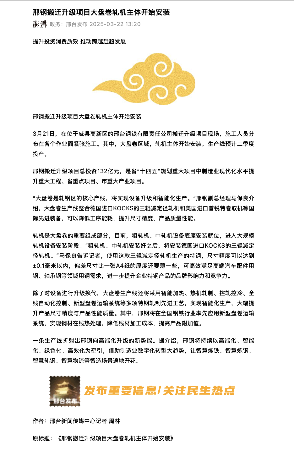 邢鋼搬遷升級項目總投資132億元,是省“十四五”規(guī)劃重大項目中制造業(yè)現(xiàn)代化水平提升重大工程、省重點項目、市重大產(chǎn)業(yè)項目。 “大盤卷是軋鋼區(qū)的核心產(chǎn)線,將實現(xiàn)設(shè)備升級和智能化生產(chǎn)。”邢鋼副總經(jīng)理馬保良介紹,大盤卷生產(chǎn)線整合德國進口KOCKS的三輥減定徑軋機和美國進口普銳特卷取機等國際先進裝備,可以降低工序能耗,提升尺寸精度、產(chǎn)品質(zhì)量性能。