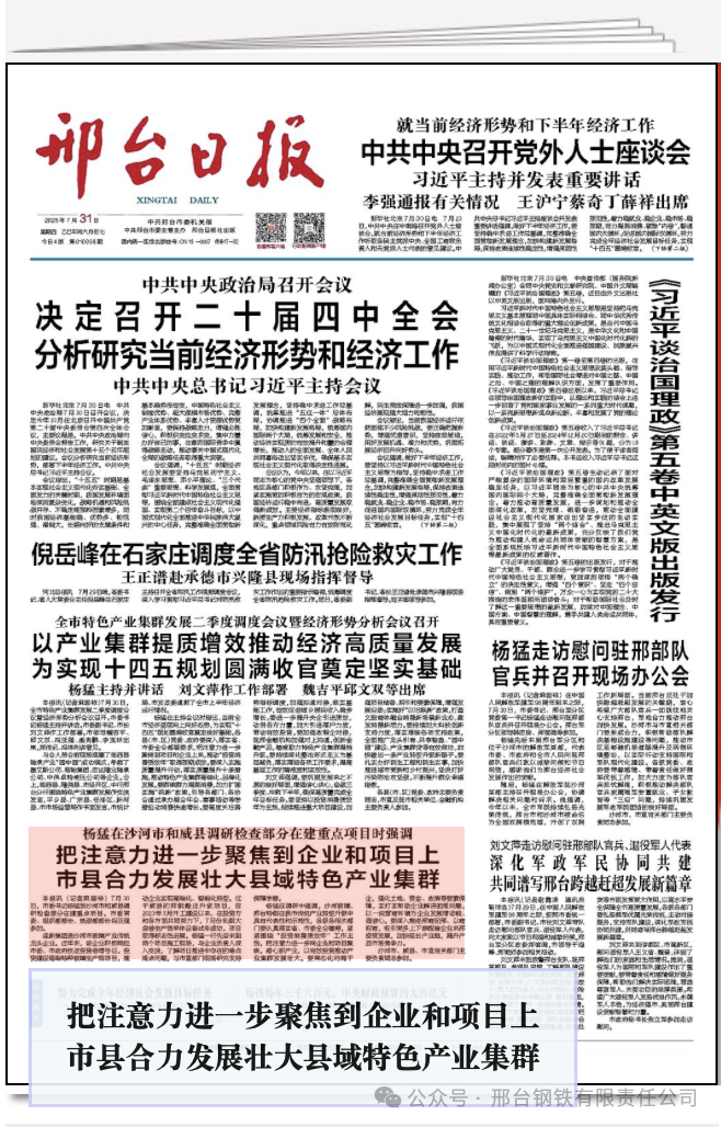 楊猛在調(diào)研中強(qiáng)調(diào),沙河玻璃、邢臺特鋼在我市傳統(tǒng)產(chǎn)業(yè)轉(zhuǎn)型升級中具有代表性和示范性,各級各相關(guān)部門要認(rèn)真落實(shí)省、市委全會(huì)精神,緊緊圍繞“投資消費(fèi)質(zhì)效年”工作主線,把注意力進(jìn)一步向企業(yè)和項(xiàng)目聚焦,潛心抓產(chǎn)業(yè),以有效投資推動(dòng)產(chǎn)業(yè)集群發(fā)展壯大。要常態(tài)化問需于企,強(qiáng)化土地、資金、政策等要素保障,實(shí)打?qū)崕椭髽I(yè)解決困難問題,以一流營商環(huán)境為企業(yè)發(fā)展增動(dòng)能、強(qiáng)信心。要深入推進(jìn)邢商回邢、以商招商,吸引更多上下游配套企業(yè)來邢投資發(fā)展,加快延長產(chǎn)業(yè)鏈,提升產(chǎn)品市場競爭力。