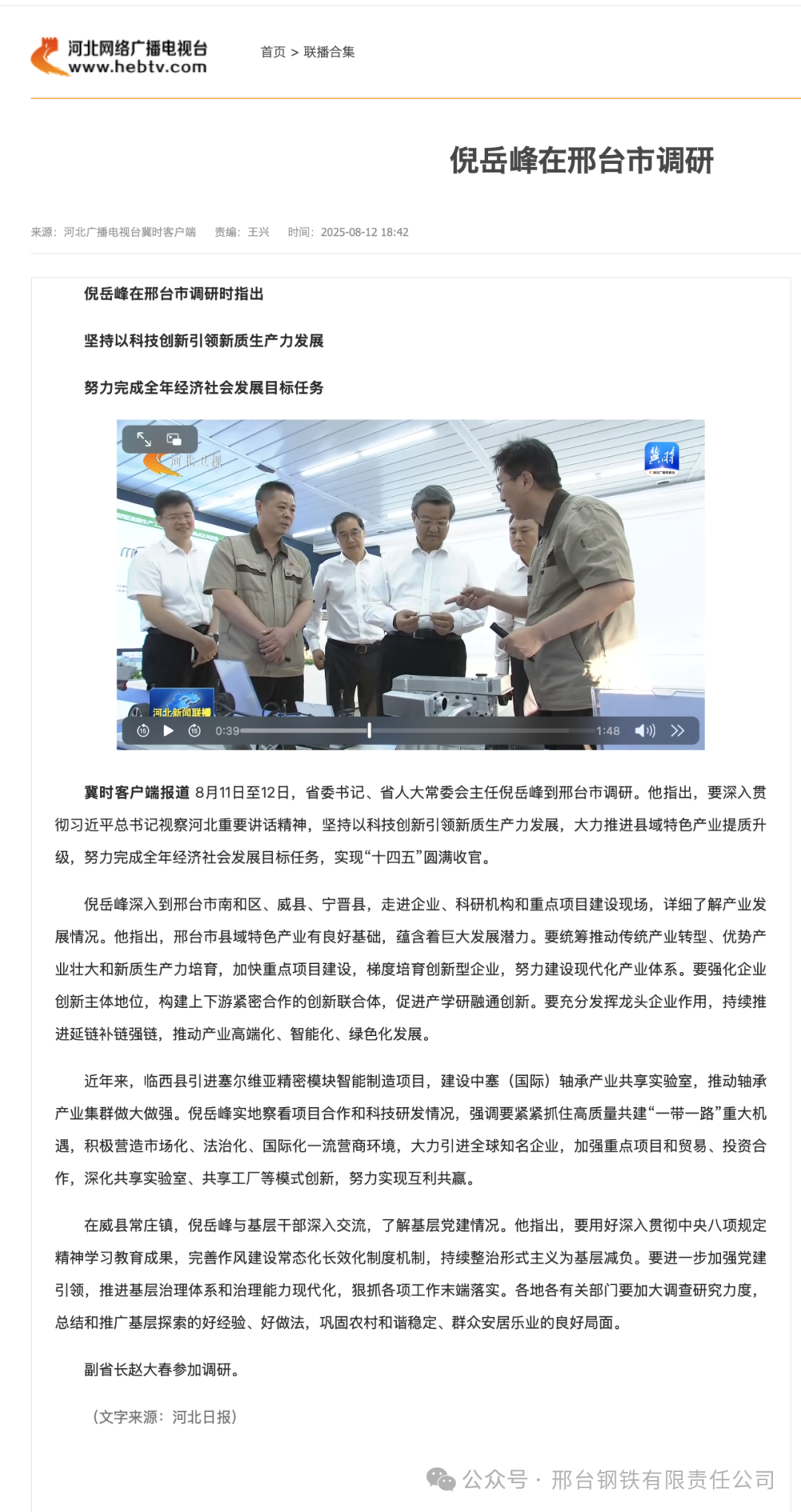 冀時客戶端報道 8月11日至12日,省委書記、省人大常委會主任倪岳峰到邢臺市調(diào)研。他指出,要深入貫徹習(xí)近平總書記視察河北重要講話精神,堅持以科技創(chuàng)新引領(lǐng)新質(zhì)生產(chǎn)力發(fā)展,大力推進縣域特色產(chǎn)業(yè)提質(zhì)升級,努力完成全年經(jīng)濟社會發(fā)展目標任務(wù),實現(xiàn)“十四五”圓滿收官。