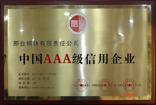 日前,在由中國合作貿(mào)易企業(yè)協(xié)會、中國企業(yè)改革與發(fā)展研究會、全國企業(yè)信用評價辦公室組織召開的中國企業(yè)科學發(fā)展論壇暨誠信表彰大會上,邢鋼被評為2010年度“中國AAA級信用企業(yè)”、公司榮獲“全國文明誠信示范單位” 稱號、董事長、總經(jīng)理袁世臻榮獲“全國優(yōu)秀誠信企業(yè)家” 稱號。